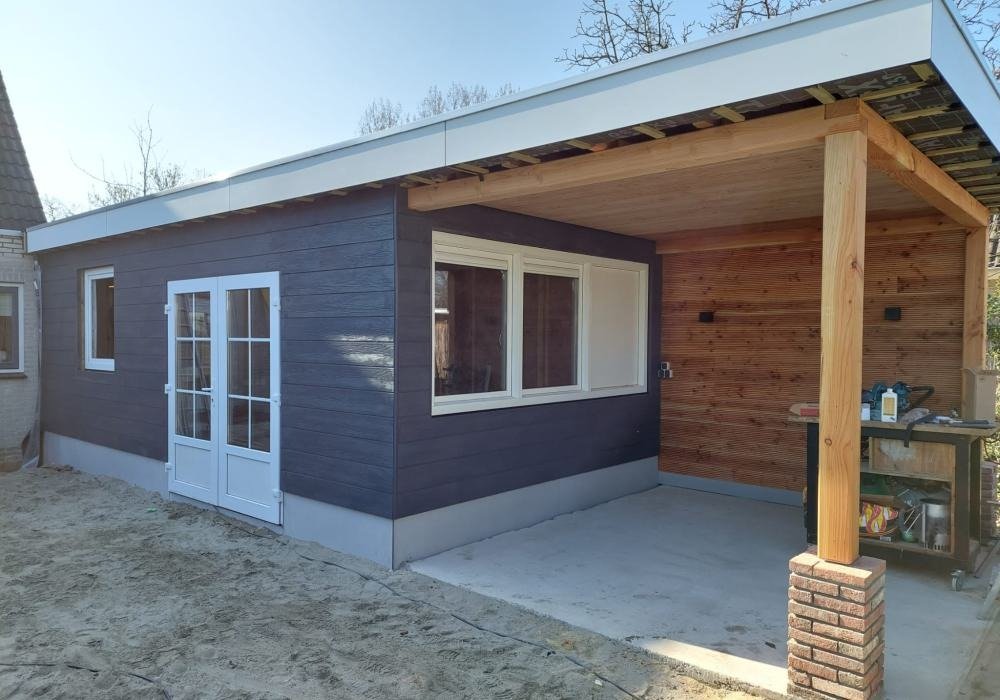 Door de combinatie van de aanbouw en de overkapping is een stijlvolle en functionele uitbreiding van de woning ontstaan waar de bewoners het hele jaar door van kunnen genieten.