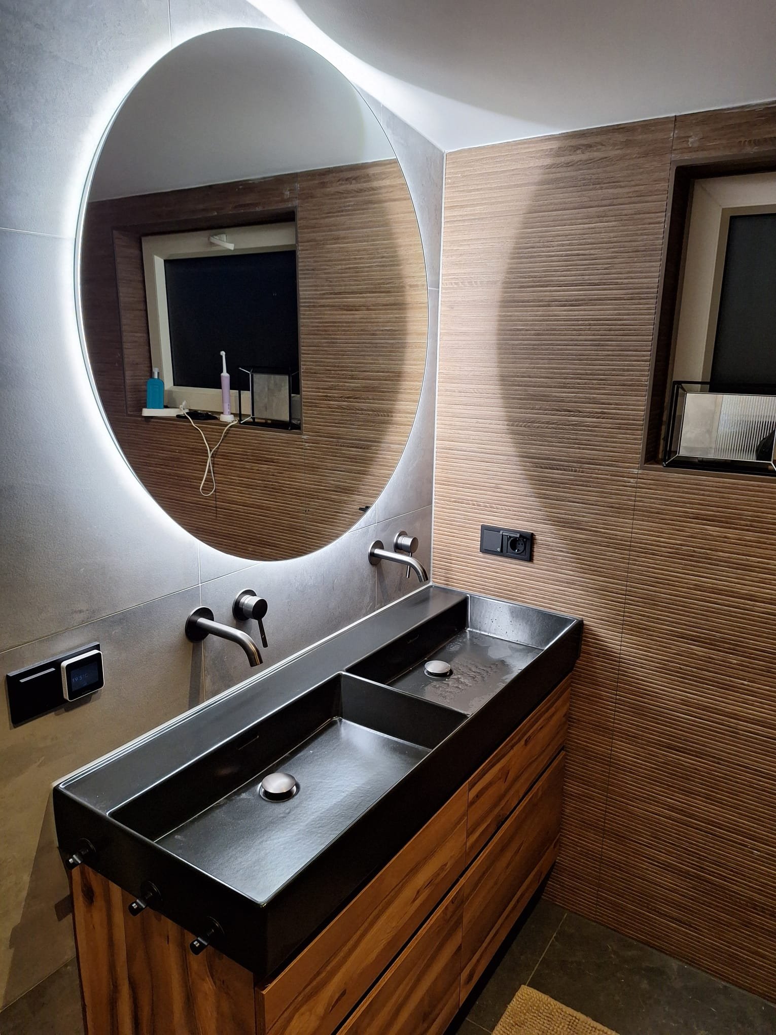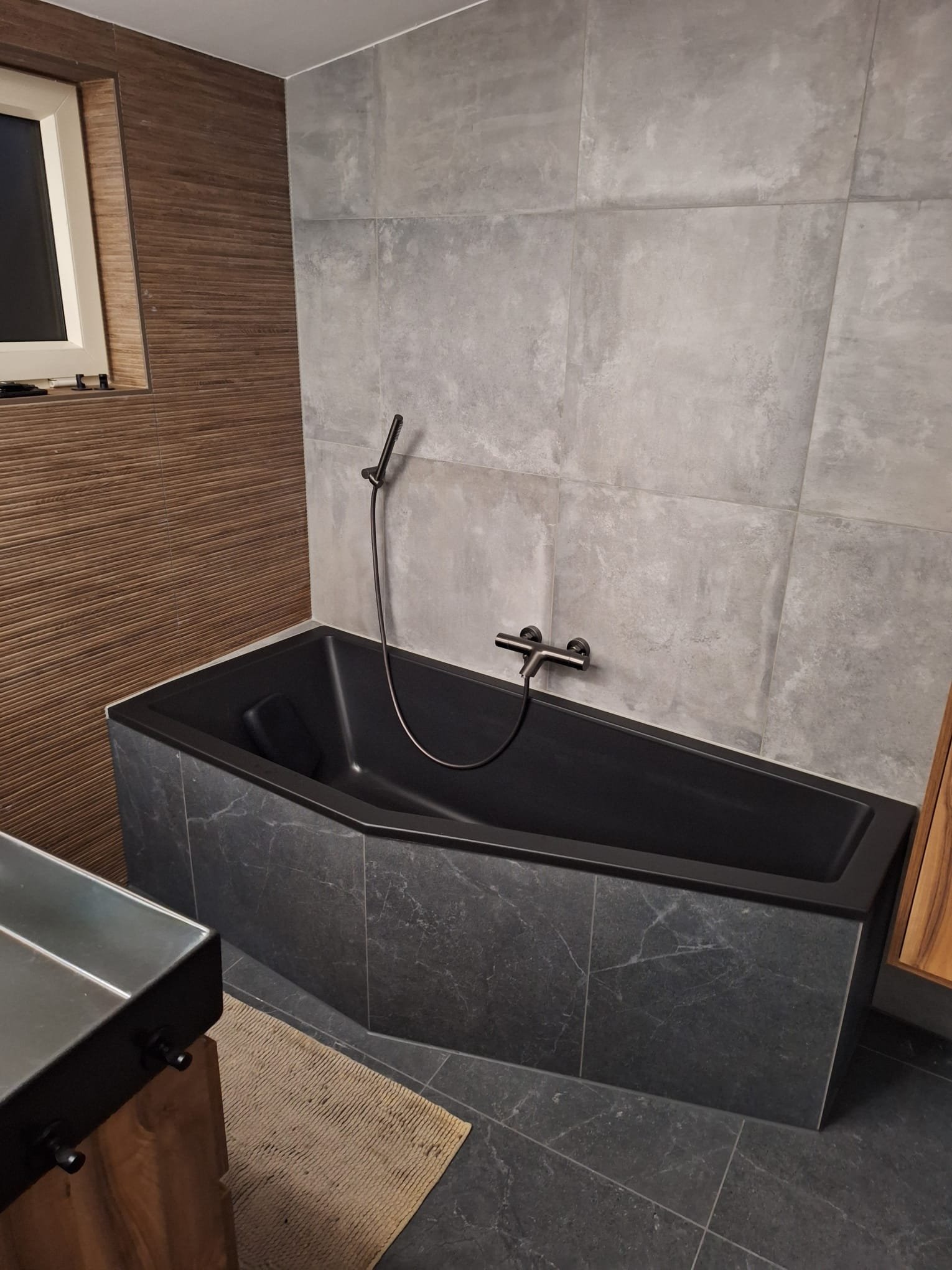 De badkamer is afgewerkt met grote tegels, moderne zwarte accenten en een strak wastafelmeubel met dubbele wasbak. De inloopdouche en het ligbad zorgen voor comfort en een luxe uitstraling.